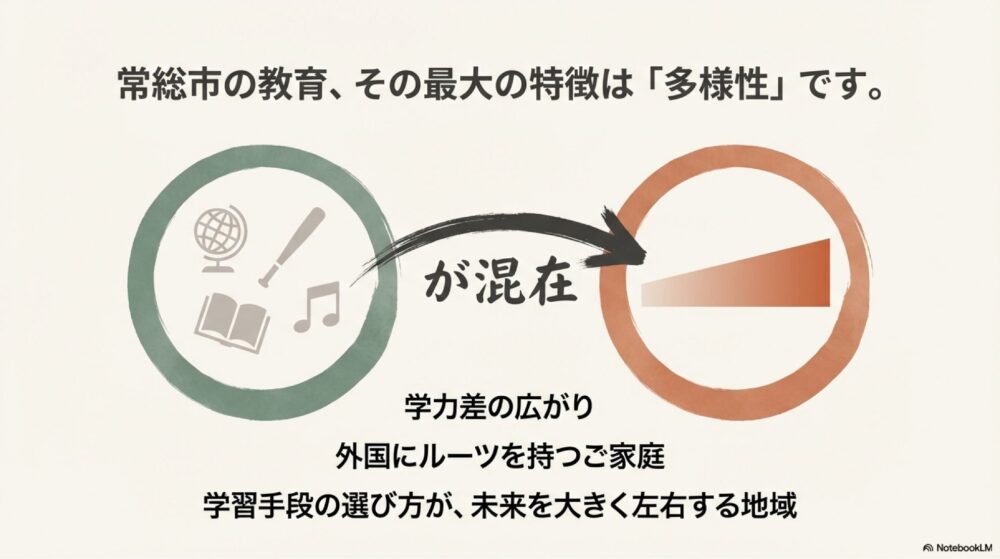 また、外国にルーツを持つ家庭が比較的多い地域でもあり、小中学校段階から学力差・生活背景の多様性が存在する点も常総市の特徴です。