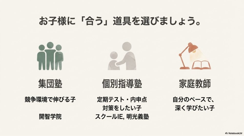 そのため、「集団塾が合う子」「個別指導や家庭教師の方が伸びやすい子」が分かれやすく、学習手段の選び方が成績や進路に直結しやすい地域とも言えます。