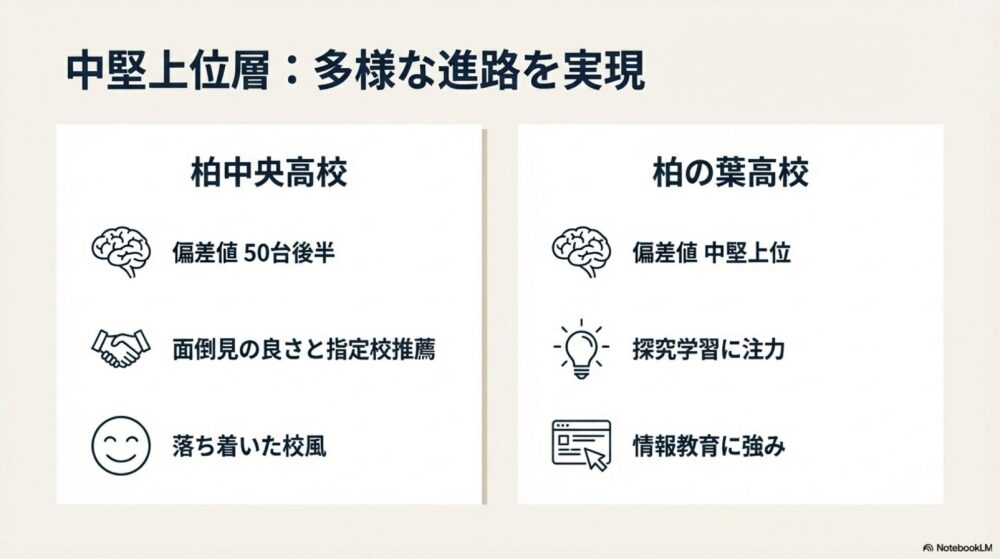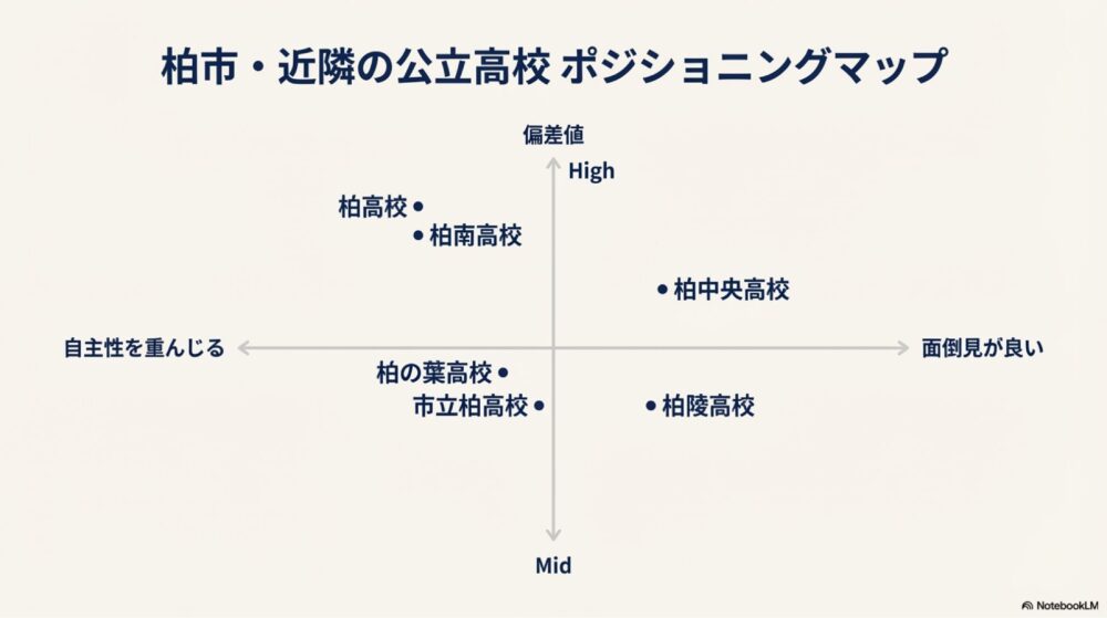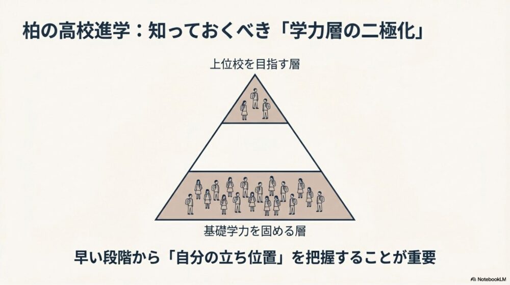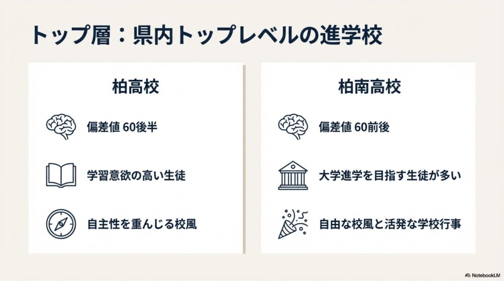 このように、柏市周辺では偏差値帯ごとに学校の役割が分かれており、成績だけでなく校風や通学距離を考慮して選ばれる傾向があります。