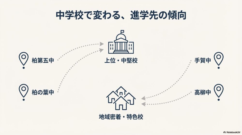 例えば、柏第五中や豊四季中、柏の葉中などは、柏高校や柏南高校、柏中央高校といった中堅から上位の公立高校を目指す生徒が一定数います。一方、手賀中や高柳中などの地域では、市立柏高校や柏陵高校、沼南高校など、比較的通学しやすさや校風を重視した進学先が選ばれることも多いようです。