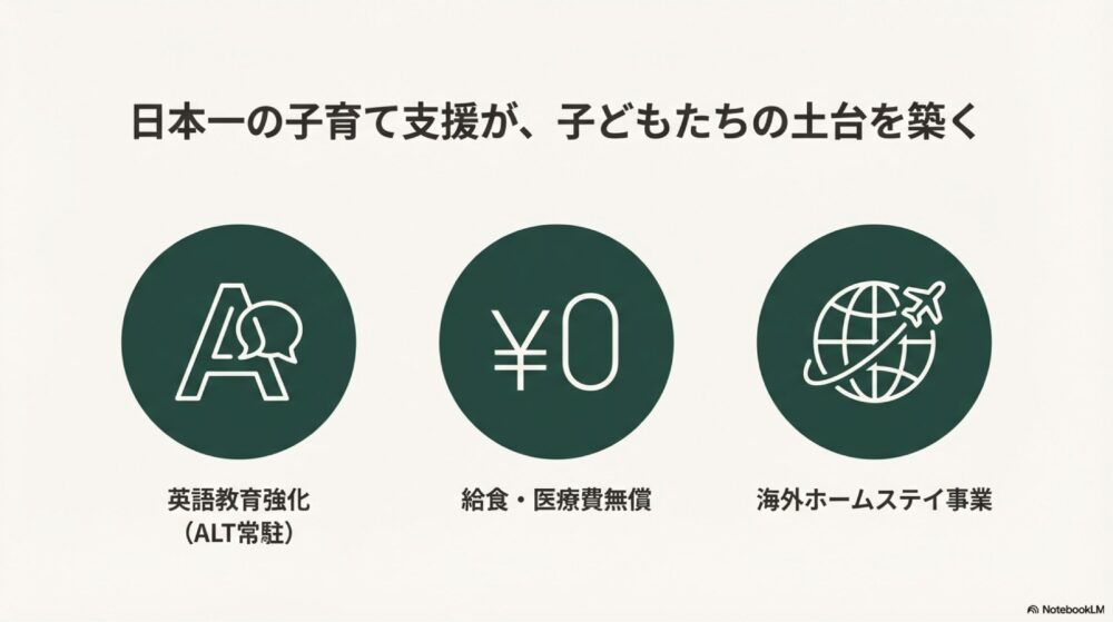 - 小中学校での英語教育強化(ALT常駐、英検受験支援)