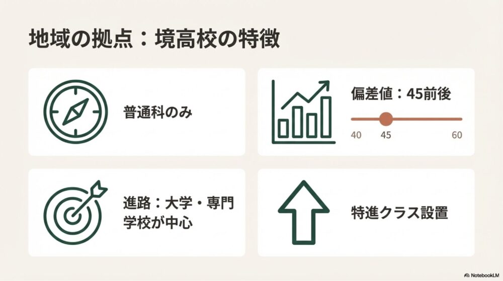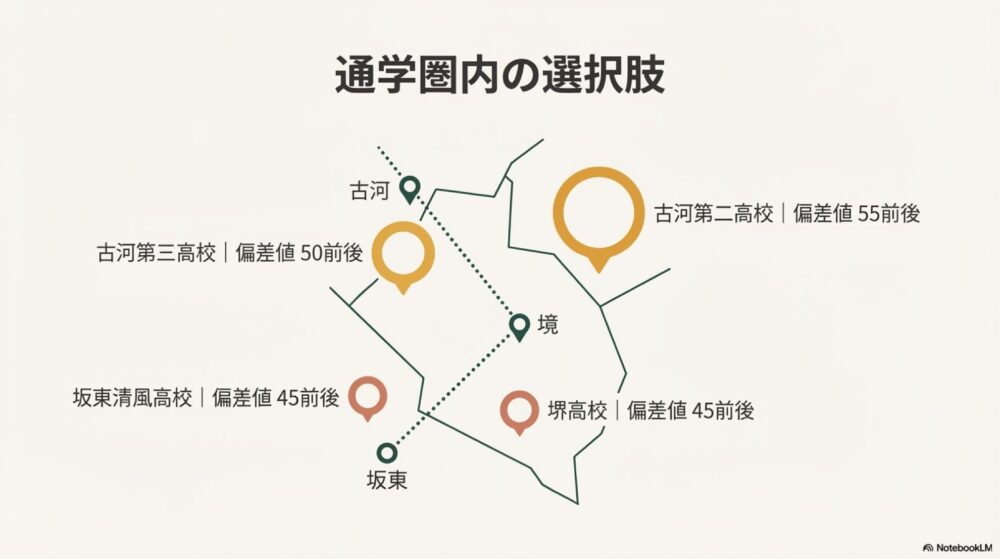 境町の中学生にとっては、「境高校を第一志望にするか」「通学時間を許容して学力帯の異なる高校を選ぶか」が進路選択のポイントになりやすい地域構造です。