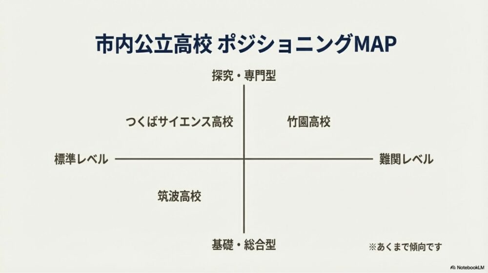 - 偏差値40前後:つくばサイエンス高校・筑波高校