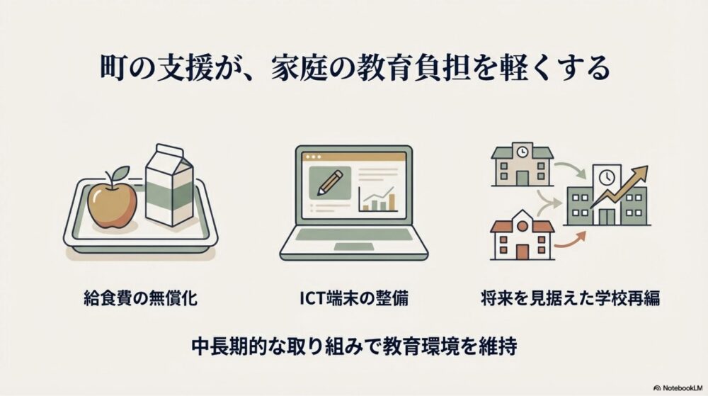 近年では、学校再編に関する基本方針の公表が話題になりました。中学校統合や小学校再編を含む計画が示され、今後の通学環境や教育体制が変化する可能性があります。保護者説明会も実施されており、町としては段階的な移行を想定しているとされています。