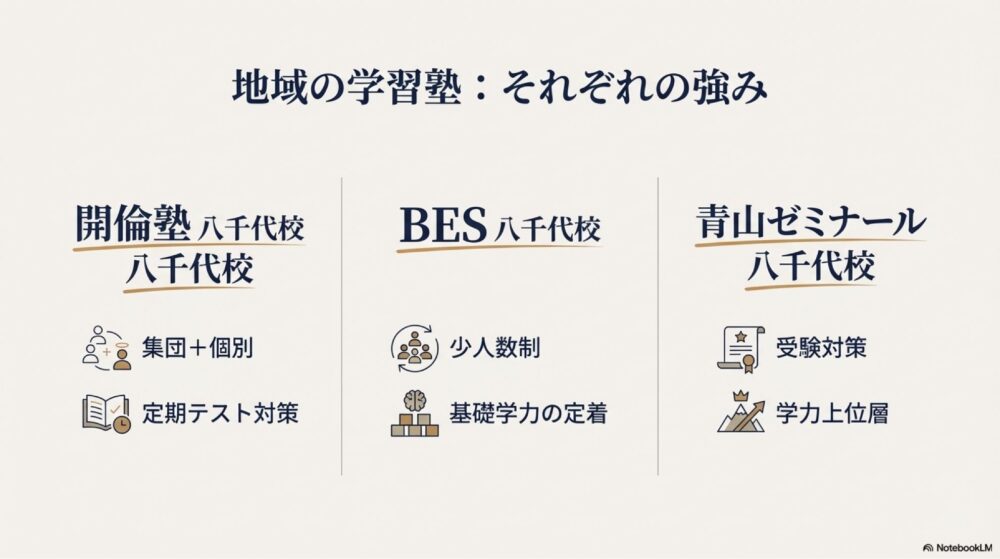 八千代町には大手進学塾が密集しているわけではありませんが、地域密着型の学習塾や、町内対応の家庭教師サービスが存在します。