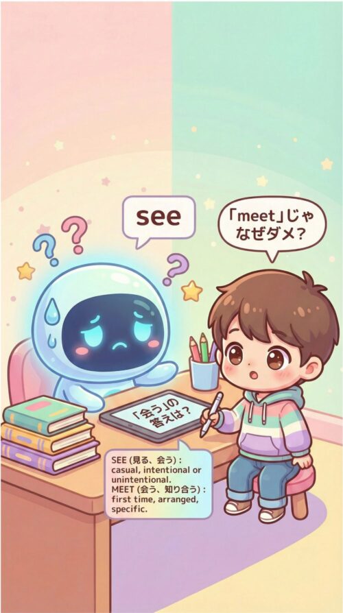 会うの答えは see です、という説明が一つだけでした。